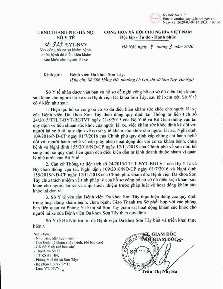 BỆNH VIỆN ĐA KHOA SƠN TÂY: CÔNG BỐ LÀ CƠ SỞ KHÁM BỆNH, CHỮA BỆNH ĐỦ ĐIỀU KIỆN KHÁM SỨC KHỎE LÁI XE