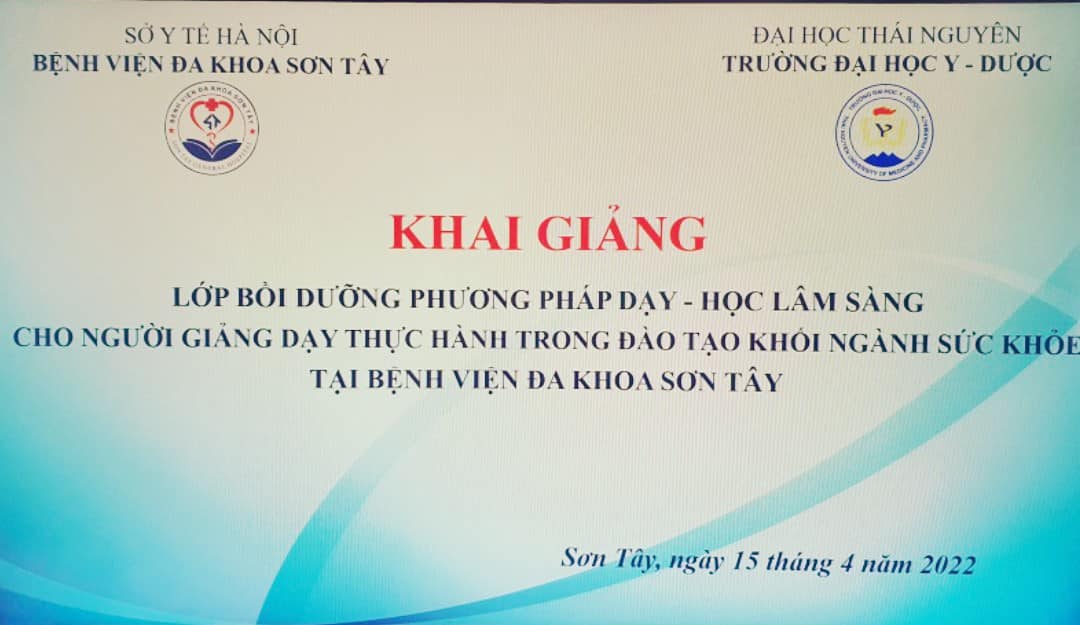 Nhằm nâng cao kiến thức và kỹ năng giảng dạy cho các cán bộ, viên chức đang công tác tại khoa/phòng. Sáng ngày 15/4/2022, bệnh viện Đa khoa Sơn Tây phối hợp với trường Đại học Y – Dược Thái Nguyên tổ chức khóa đào tạo “Phương pháp giảng dạy – học lâm sàng cho người giảng dạy thực hành trong đào tạo khối ngành sức khỏe”. Khóa đào tạo giúp học viên có thể xây dựng được kế hoạch dạy – học, lựa chọn và áp dụng hiệu quả các phương pháp dạy – học tích cực và phương pháp lượng giá trong đào tạo khối ngành sức khỏe.