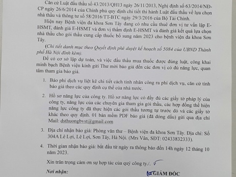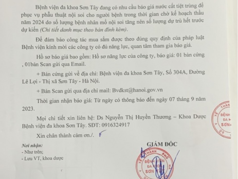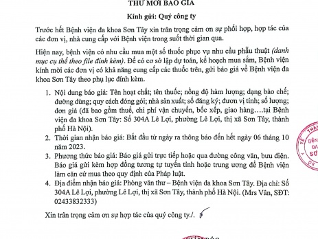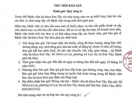 Chào giá TTB y tế nguồn ngân sách 2023 của Bệnh viện đa khoa Sơn Tây