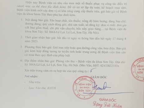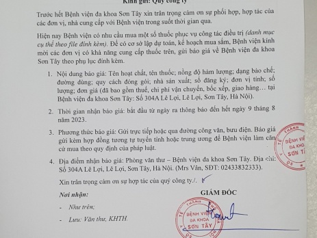 Mời chào giá trang thiết bị y tế mua sắm nguồn ngân sách 2023 của bệnh viện đa khoa Sơn Tây