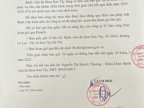 Thư mời báo giá vật tư khoa Mắt trong thời gian chờ kết quả thầu năm 2023-2024