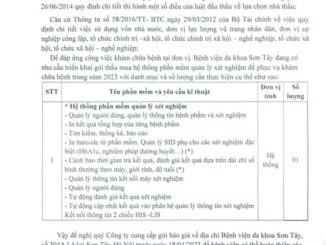 Thư mời báo giá dịch vụ triển khai gói thầu mua hệ thống phần mềm quản lý xét nghiệm.