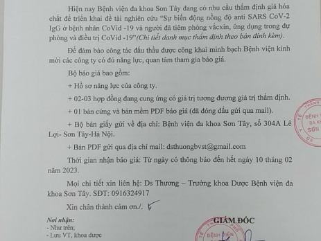 Quý công ty click vào đây để tải thư báo mời báo giá và nội dung các gói vật tư hoá chất cần thẩm định.