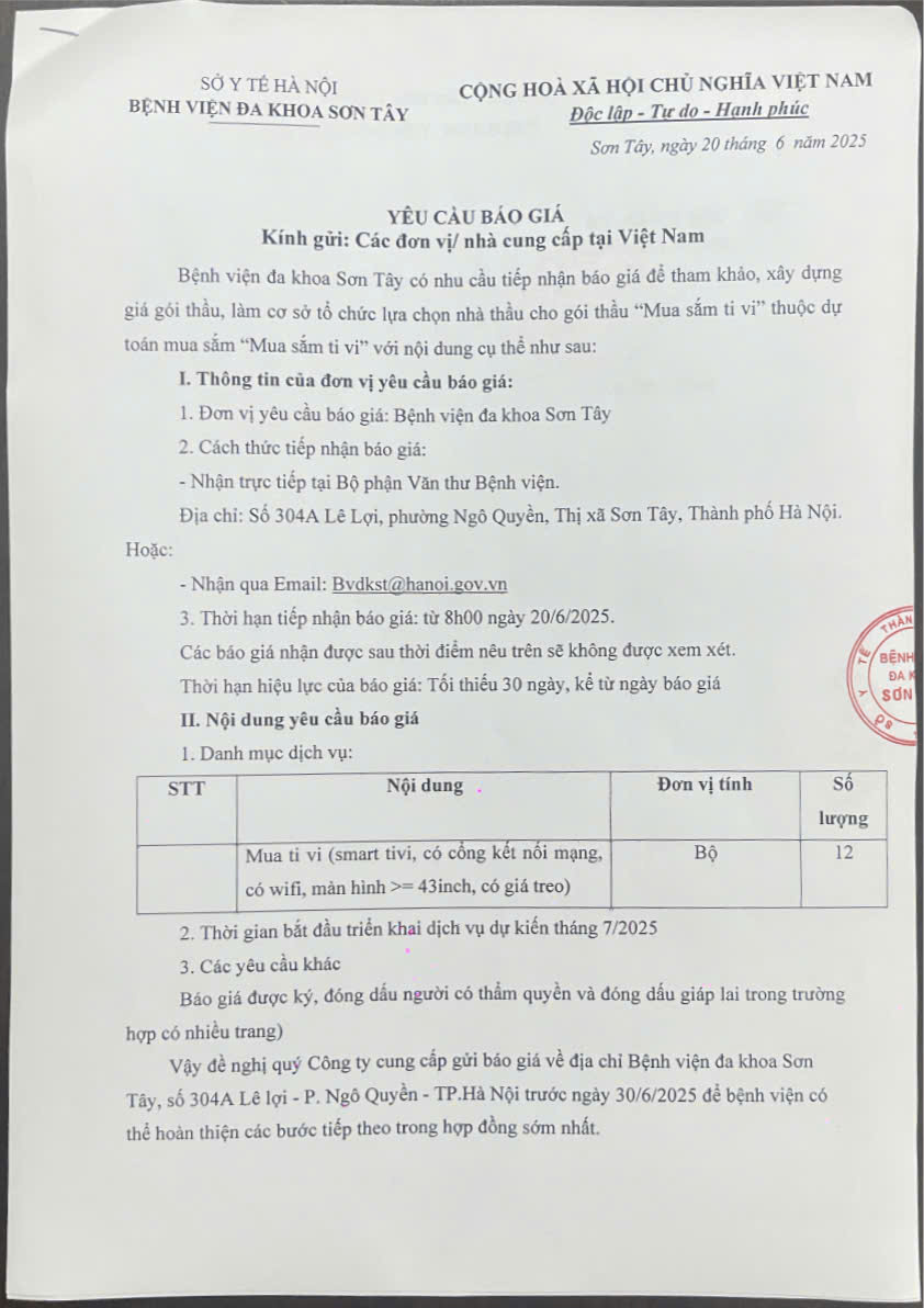 20 Th6Thư mời báo giá BVDK Sơn Tây2025-07-04T15:52:43+07:00 Tin tứcBình luậnShare this postFacebookTwitterLinkedInGoogle +
