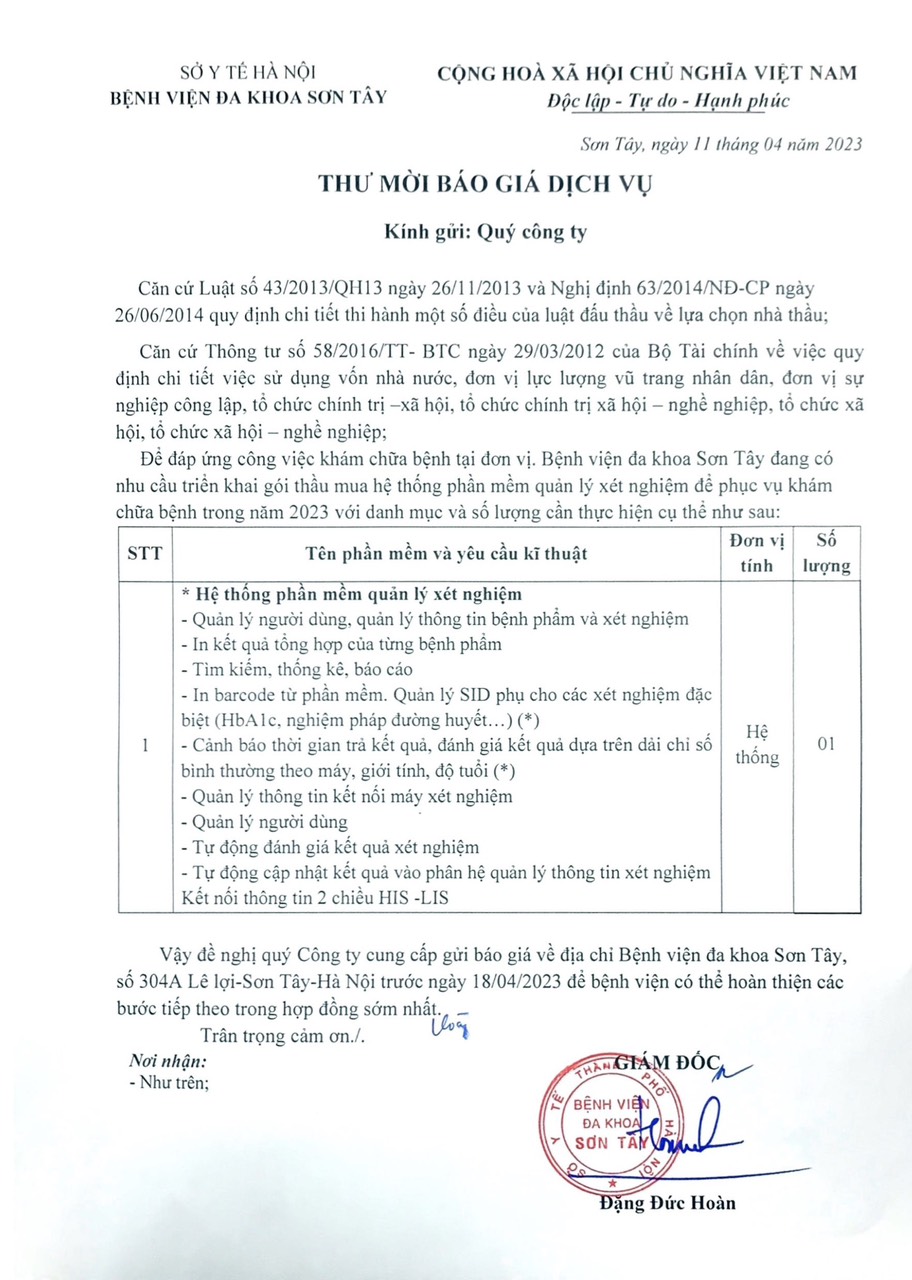 • Thư mời báo giá dịch vụ triển khai gói thầu mua hệ thống phần mềm quản lý xét nghiệm.
