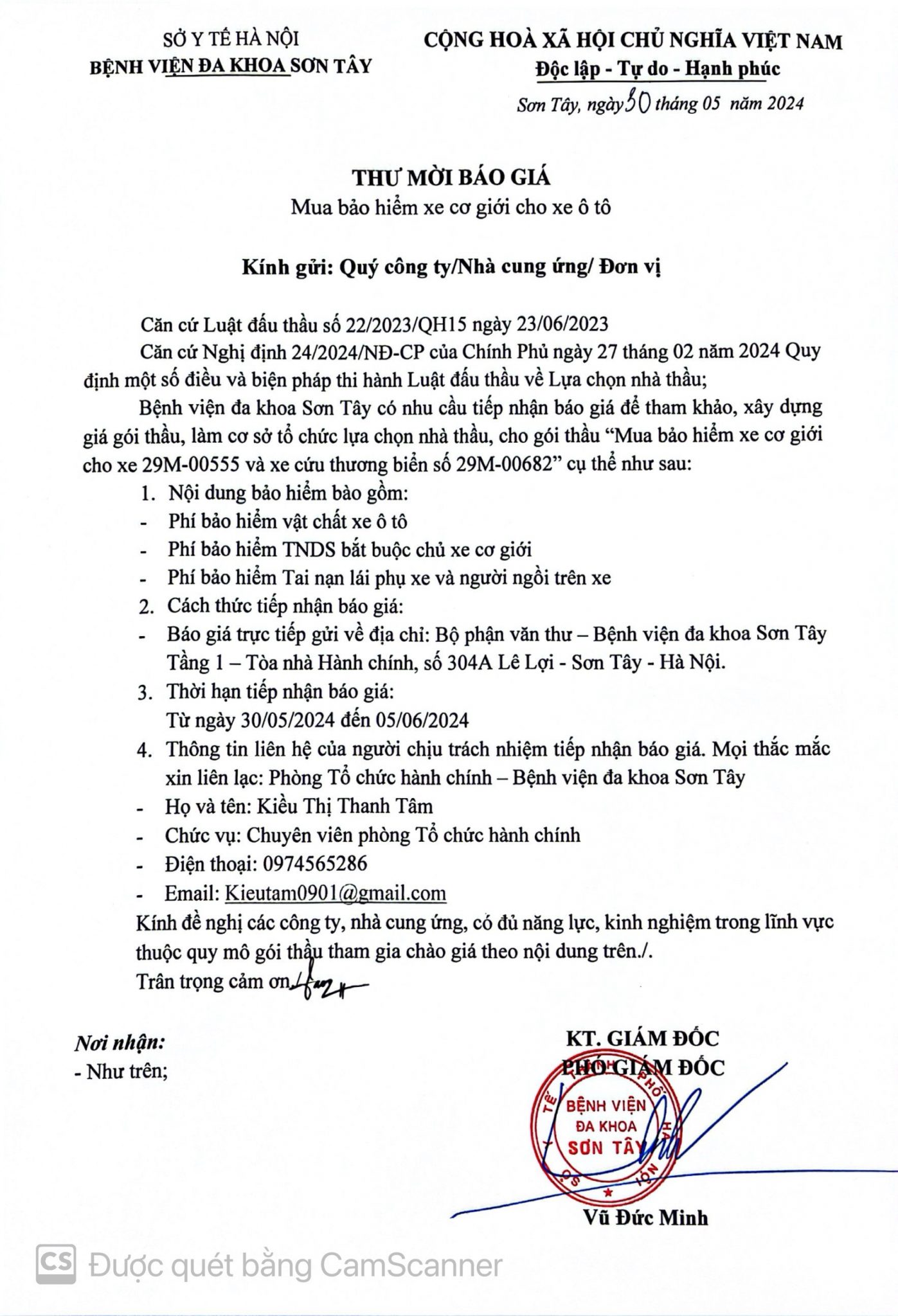 30 Th5Thư mời báo giá mua Bảo hiểm xe cơ giới cho xe ô tô BVDK Sơn Tây2024-05-30T11:48:31+07:00 Tin tứcBình luậnShare this postFacebookTwitterLinkedInGoogle +
