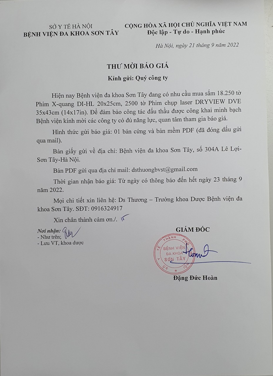 21 Th9Thư mời báo giá Phim X-Quang BVDK Sơn Tây2022-09-21T22:16:05+07:00 Tin tứcBình luậnShare this postFacebookTwitterLinkedInGoogle +