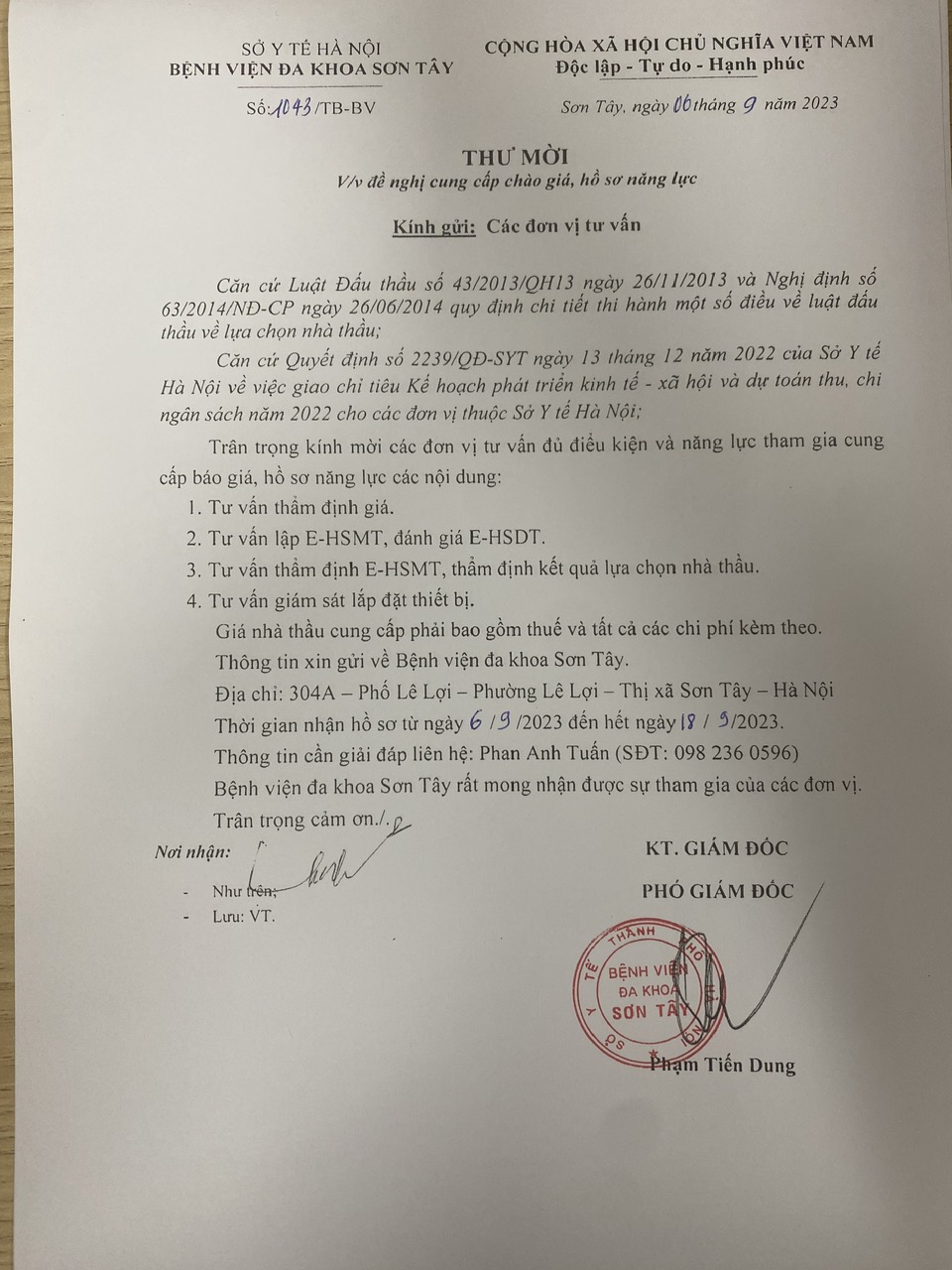 06 Th9thư mời chào giá dịch vụ BVDK Sơn Tây2023-09-23T08:34:41+07:00 Tin tứcBình luậnShare this postFacebookTwitterLinkedInGoogle +